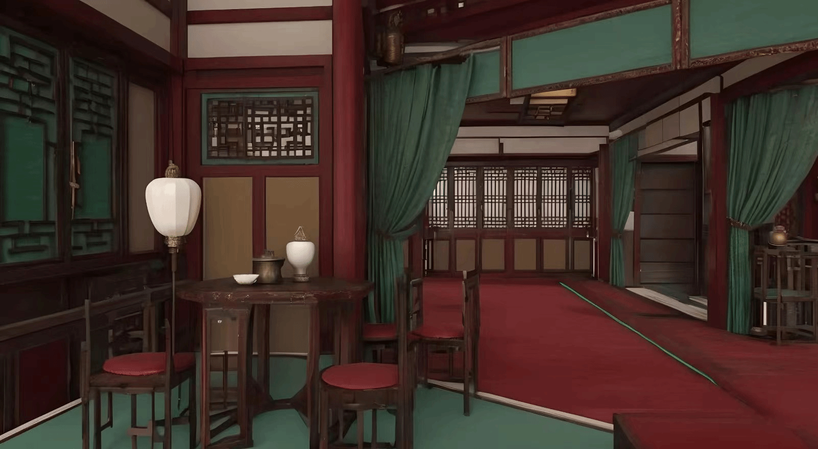 关键词:古代茶楼建筑3d模型,高细节,红绿对比色搭配,第一人称视角