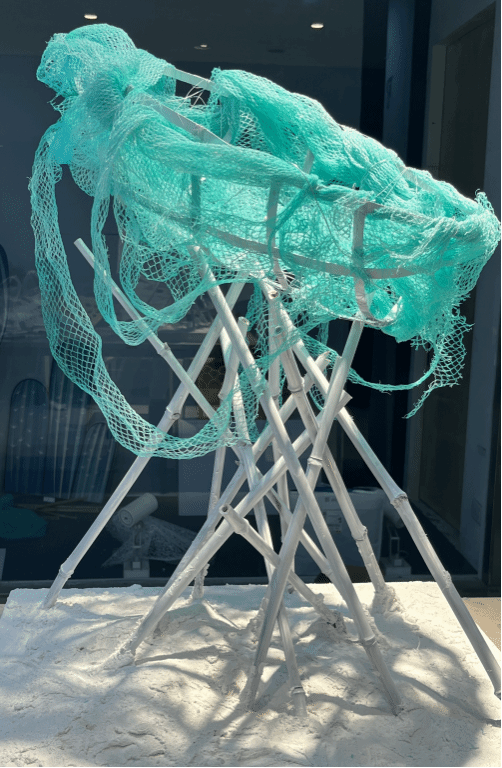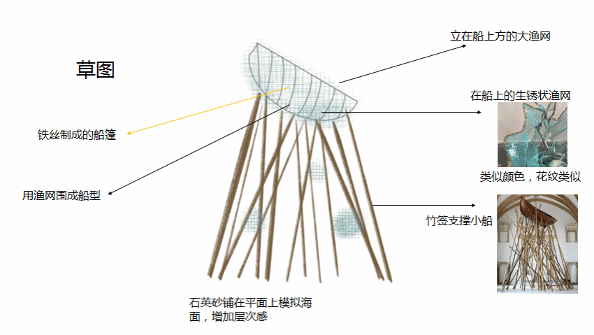 灵感说明:通过废弃竹子、铁丝和渔网制作了整个作品,呼应了废物利用的主题。青,生命之色,东方之色。艺术装置打破原有固定思维,参照古典的船体元素,运用钢丝构造船骨架,用竹子打造海浪的节奏,与当代材质碰撞,富有形式感的异形结构相互错位,嵌套,让其充满秩序感。