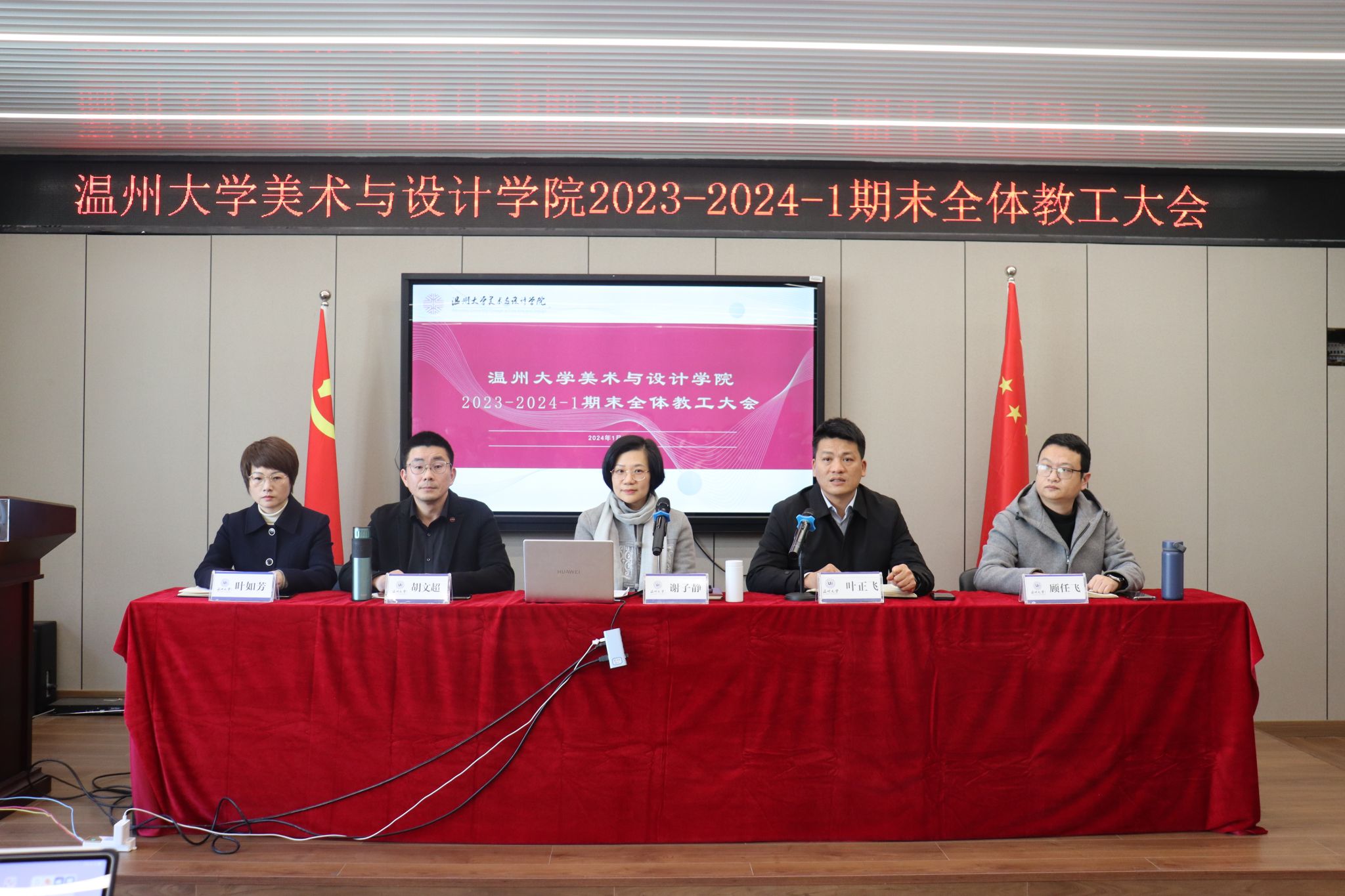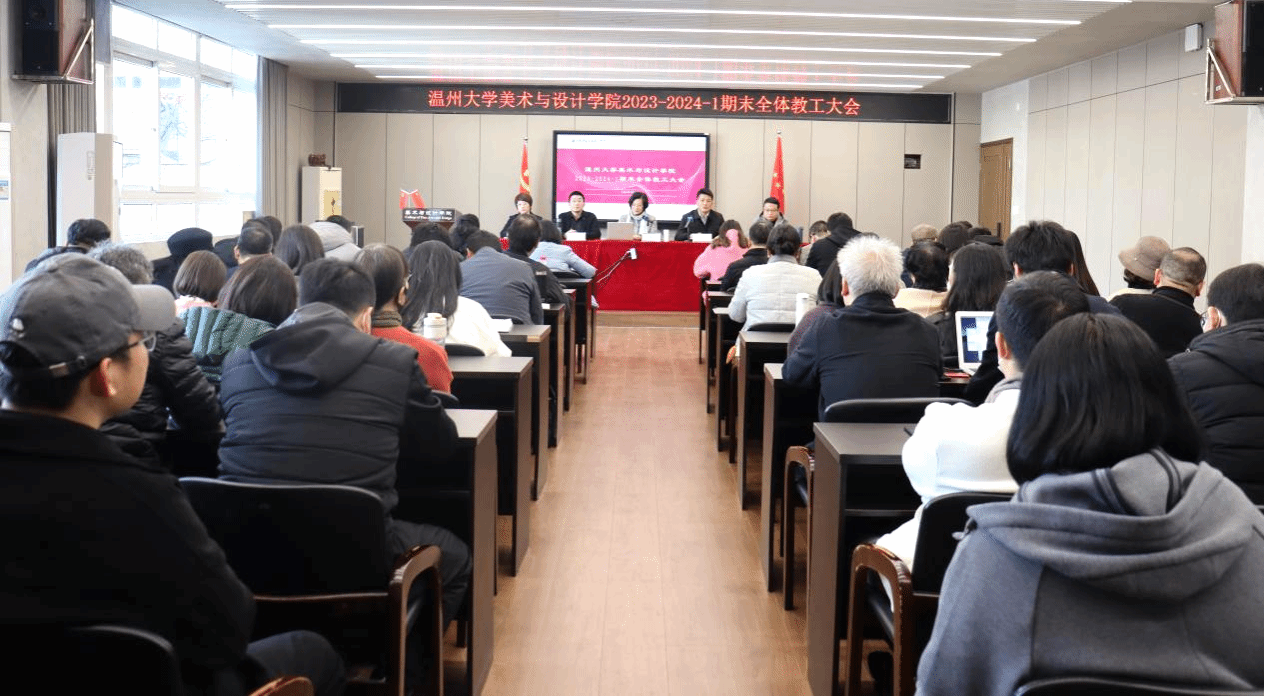 1月17日,在美术楼2B4001召开js6668金沙登录入口全体教工大会,学院领导班子及全体教职工参加本次会议,会议由学院党委书记叶正飞主持。会议伊始,学院为派驻温州理工学院支教期满教师举行了回归欢迎仪式。叶正飞书记逐一欢迎程治国、陈李冬、葛华东、胡骅、罗利龙、许学民、余晓冬等七位教师,全体教工热烈欢迎并祝贺七位教师们回归学院大家庭。随后,各分管领导进行工作部署,胡文超副院长、顾任飞副院长、叶如芳副书记分别对寒假前后教学及人才培养、学科建设及科研工作、学生就业及安全工作等方面进行重点部署。叶正飞书记强调,寒假期间值班、教师出行报备以及安全要求,并要求全体教师重点关心关注学生动态,深入开展关爱行动,切实做到家校联动。会上,谢子静院长作总结讲话。首先,谢院长回顾了2023年学院所取得的丰硕成果。在校党委的正确领导和大力支持以及全院师生凝心聚力和不懈努力下,学院在学科科研、教学及人才培养、人才队伍建设、美育建设、服务地方及党建工作等六方面取得了一系列标志性成果,并对全院教职工一年来的辛勤付出表示肯定和感谢。随后,谢院长提出2024年学院的工作思路和要求,并作题为《以美育人 以美培元——美育教育新路径研究》的专题报告,提出学院差异化特色发展之路。最后,谢院长要求全体教职工把立德树人体现在对教育事业的忠诚上、对学生的关爱上、师德师风的建设上,切实加强人才培养内涵建设;对标学科和博士点建设要求,科学确立发展目标,有效制定和推进中长期、年度工作计划,精准推进各项工作;发挥团队协同力量,凝心聚力、同心同德,提升工作效率和成效,再创美院新辉煌。