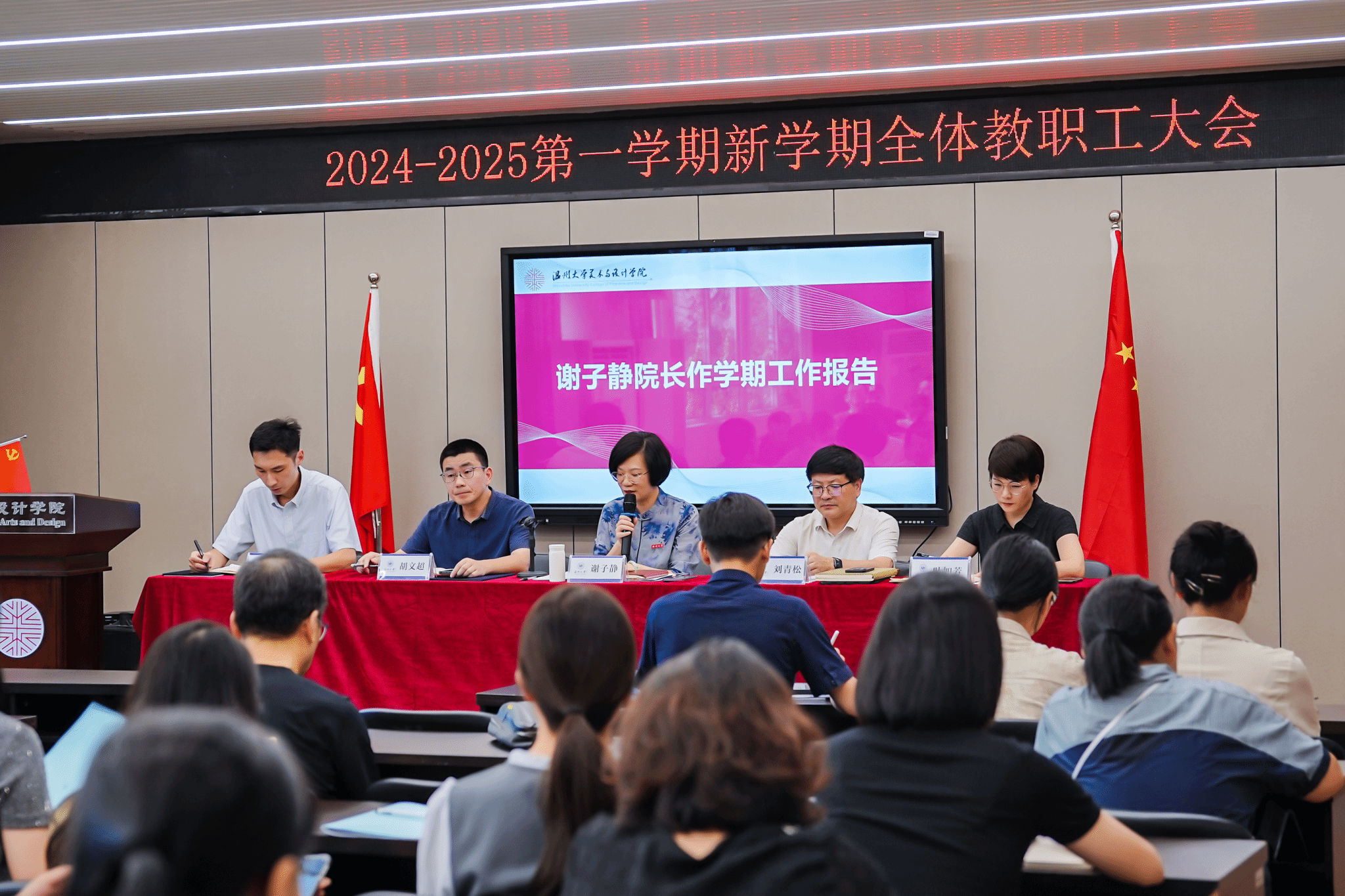 会上,谢子静院长作学期工作报告,她总结了过去一学期和暑假期间,学院各系室、部门在争创一流学科、学术交流等八个方面取得的优异工作成绩,肯定了老师们取得的丰硕成果和服务地方的各项行动。随后,谢子静院长详细部署了新学期的工作重点,学院要锚定“两大目标”,立足“十大重点项目”,使金沙官网在专业内涵发展、学科提升、毕业展秀、毕业生就业质量、引才引智、美育文化、维稳与安全、党建促发展等方面取得新的成效。同时,顺应时代发展新契机,拥抱AI新科技,迎接教育未来,发挥学科、专业优势,推动美育建设,提升美育成效,强化产业链接,促进校地服务与合作,打造学院发展新亮点。胡文超副、叶如芳副书记、高玥委员作工作部署,刘青松书作新学期工作部署。