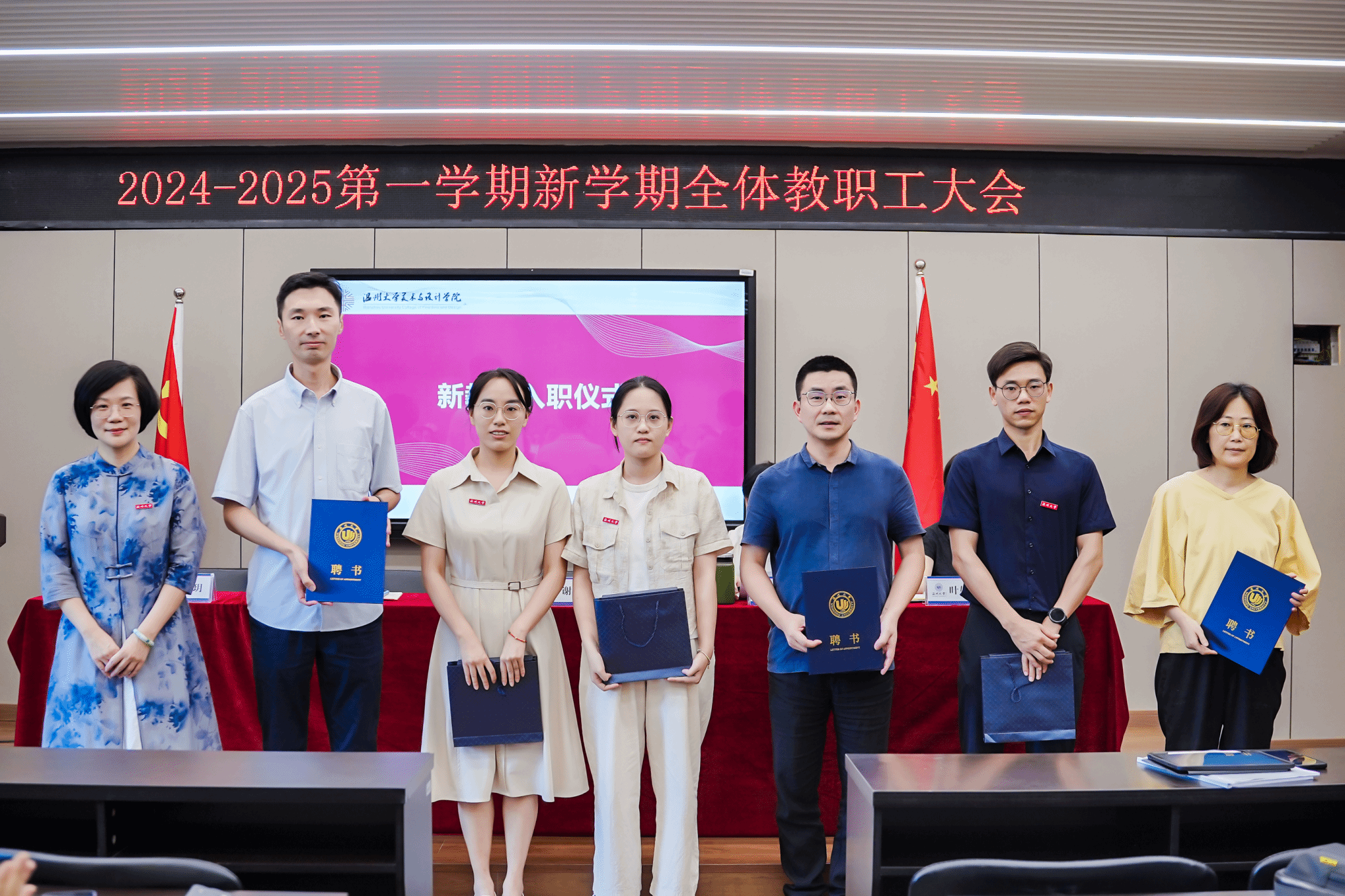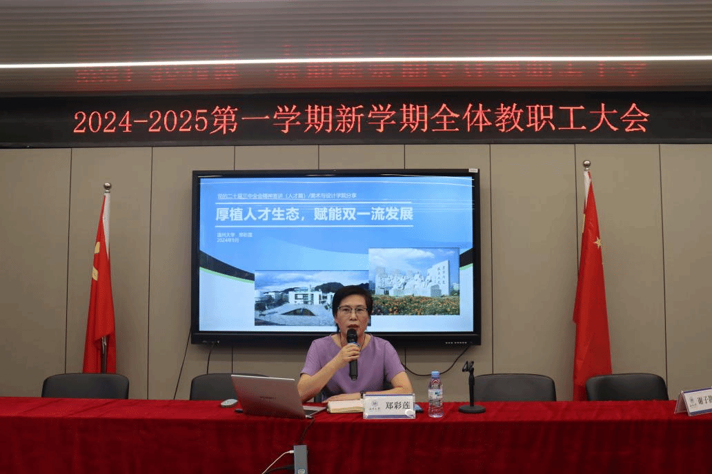 金秋奋进时,万象迎新季。9月12日下午,js6668金沙登录入口召开2024-2025学年秋季新学期全体教职工大会,本次会议由党委书记刘青松主持,学院领导班子、全体教职工参加。恰逢第40个教师节来临之际,会上,刘青松书记对全体教职工致以诚挚的问候和祝福。会议的第一项议程,举行了新教师入职仪式,由谢子静院长为本学期三位新入职的教师佩戴校徽、赠送大礼包、颁发导师聘书。会上,谢子静院长作学期工作报告,她总结了过去一学期和暑假期间,学院各系室、部门在争创一流学科、学术交流等八个方面取得的优异工作成绩,肯定了老师们取得的丰硕成果和服务地方的各项行动。随后,谢子静院长详细部署了新学期的工作重点,学院要锚定“两大目标”,立足“十大重点项目”,使金沙官网在专业内涵发展、学科提升、毕业展秀、毕业生就业质量、引才引智、美育文化、维稳与安全、党建促发展等方面取得新的成效。同时,顺应时代发展新契机,拥抱AI新科技,迎接教育未来,发挥学科、专业优势,推动美育建设,提升美育成效,强化产业链接,促进校地服务与合作,打造学院发展新亮点。胡文超副、叶如芳副书记、高玥委员作工作部署,刘青松书作新学期工作部署。会议后半段,由郑彩莲教授为学院教职工带来主题为“厚植人才生态,赋能双一流发展”的讲座。她立足当前高校发展形式,从人才现状、问题成因、对策举措、人事文化四个方面开展介绍,从我校教科研人才队伍基本情况着眼,分析人才结构、全职业周期人才发展支持政策体系,人才评定称号等,结合金沙官网的具体情况,提出金沙官网人才发展的建议意见,要聚焦学科建设,开拓国际视野,引进海内外顶尖人才,对学院做好人才队伍建设起到重要作用。