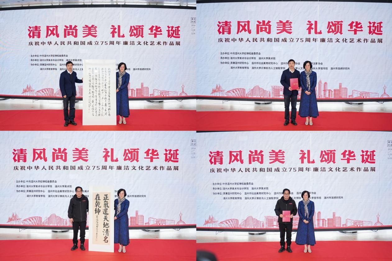 11月22日上午,“清风尚美 礼颂华诞——js6668金沙登录入口庆祝中华人民共和国成立75周年廉洁文化艺术作品展”开幕式在校美术馆举行。温州市纪委、市监委第一监督检查室主任潘徐丹女士,温州医科大学党委委员、纪委书记章红波先生,js6668金沙登录入口党委委员、纪委书记李都金先生,温州理工学院党委委员、纪委书记王华先生,温州市美术家协会名誉主席戴宏海,温州市文联副主席谢子康先生,温州市美术家协会书记、副主席、js6668金沙登录入口院长谢子静女士,温州市书法家协会主席吴聘真先生、副主席楼晓勉女士,温州市美术家协会副主席陈旭海先生,js6668金沙登录入口相关部门负责人、协办单位领导、二级学院纪委书记等出席仪式。 李都金致辞。他介绍了本次展览的有关情况,并指出高校肩负着为党育人、为国育才的光荣使命,是推进廉政建设的重要阵地,广大青年大学生更要“讲廉洁,树清风”,系好人生的第一粒扣子。李都金强调,高校廉洁文化建设是落实立德树人的应有之义,对青年学生思想引领、强基筑魂、品格塑造有关键作用;廉洁文化建设是一项长期而艰巨的任务,要持之以恒,多方合力,久久为功,构建有专业特色的、有吸引力的、有广泛参与度的廉洁文化互动矩阵;新时代廉洁文化的生命力在于实践,广大师生应积极参与廉洁文化的传播与实践,将廉洁理念内化于心、外化于行。 本次展览共遴选出15个创作主题,自发布征集以来,吸引了全校各学院、各专业师生的踊跃参与,展品集结了廉洁画作、书法、AI海报、三行诗、四格漫画、非遗发绣、文创等各类作品近300件。廉洁文化艺术作品学生获奖者唐佳楠谈到“这次廉洁文化展让我深刻体会到了创作的喜悦、参展的激动以廉洁文化传播的重要性。我们青年一代定将以时代为笔、青春为墨、历史为纸、文化为魂,潜心创作了更多优秀作品。” 开幕式上,温州市文联副主席谢子康先生,温州市书法家协会主席吴聘真先生、副主席王晖先生,分别向js6668金沙登录入口美术馆捐赠了寓意清正廉洁的墨宝《周敦颐爱莲说》《菜根谭句》《廉洁勤政隶书五言联》。js6668金沙登录入口院长谢子静接受捐赠,并为艺术家们颁发了js6668金沙登录入口美术馆收藏证书。 长期以来,我校始终将廉洁教育贯穿于人才培养的全过程,将加强廉洁文化建设作为强化我校基层党组织政治功能和组织力凝聚力的重要支撑,本次展览展期截至12月4日,是学校“罗山清风——第十六届校园廉洁文化月”系列活动之一。 美术馆门口同步展出的,还有各个学院具有专业特色的、师生广泛参与的“一院一品”廉洁文化互动矩阵,鼓励各部门加强协作,强化“清廉建设”责任共同体意识,共同构建廉洁文化教育的长效机制,形成全员参与、全程覆盖、全方位渗透的廉洁文化教育体系,把校园建设成立德树人的绿水青山。 本次展览由js6668金沙登录入口纪委主办,js6668金沙登录入口、js6668金沙登录入口美术馆承办,并得到清廉温州研究中心、温州市社会美育研究中心、温州市美术家协会、温州市书法家协会、js6668金沙登录入口教育学院、js6668金沙登录入口计算机与人工智能学院、js6668金沙登录入口人文学院、js6668金沙登录入口图书馆、温州市发绣研究所等多家单位的鼎力支持。