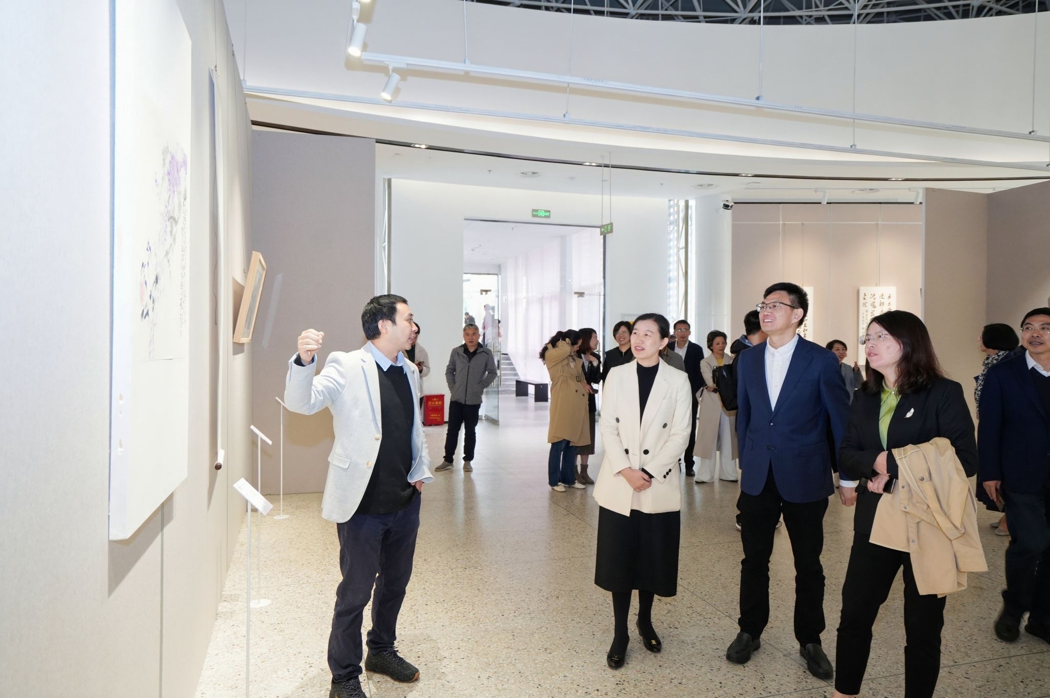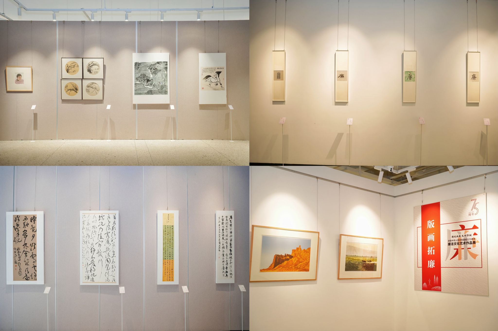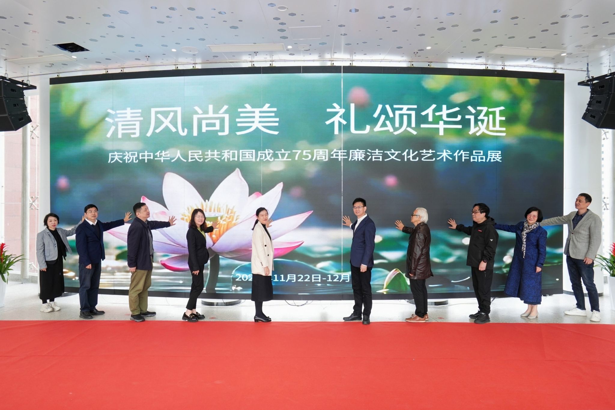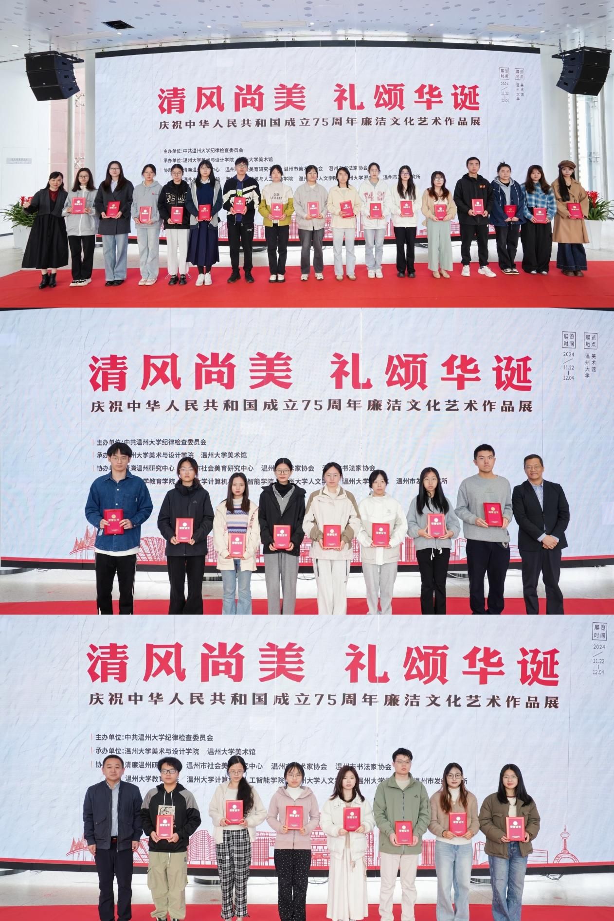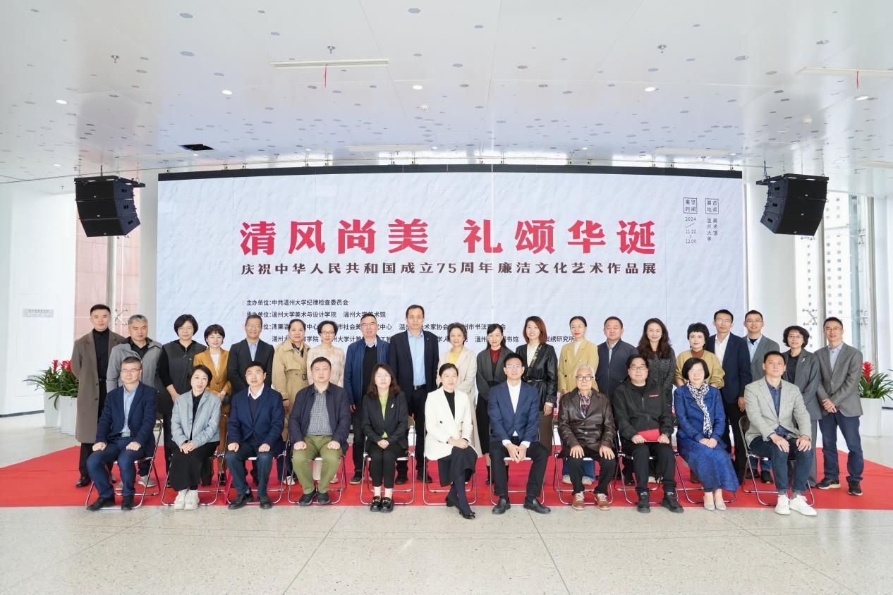 11月22日上午,“清风尚美 礼颂华诞——js6668金沙登录入口庆祝中华人民共和国成立75周年廉洁文化艺术作品展”开幕式在校美术馆举行。温州市纪委、市监委第一监督检查室主任潘徐丹女士,温州医科大学党委委员、纪委书记章红波先生,js6668金沙登录入口党委委员、纪委书记李都金先生,温州理工学院党委委员、纪委书记王华先生,温州市美术家协会名誉主席戴宏海,温州市文联副主席谢子康先生,温州市美术家协会书记、副主席、js6668金沙登录入口院长谢子静女士,温州市书法家协会主席吴聘真先生、副主席楼晓勉女士,温州市美术家协会副主席陈旭海先生,js6668金沙登录入口相关部门负责人、协办单位领导、二级学院纪委书记等出席仪式。