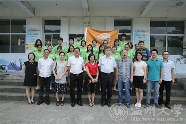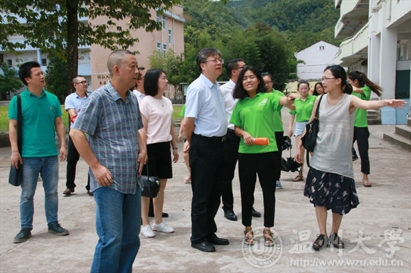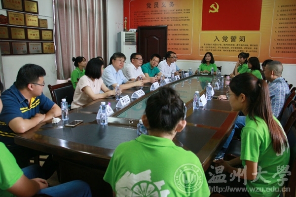 7月17日上午,js6668金沙登录入口校长李校堃、党校办主任王定福、校团委书记屠霁霞、校团委副书记熊琳一行在金沙官网党总支副书记杨振海、学生科副科长叶筱卉的陪同下来到文成县大峃镇樟台乡希望小学,对正在这里开展暑期社会实践的“绘暖向南”大学生暑期社会实践队进行了慰问。