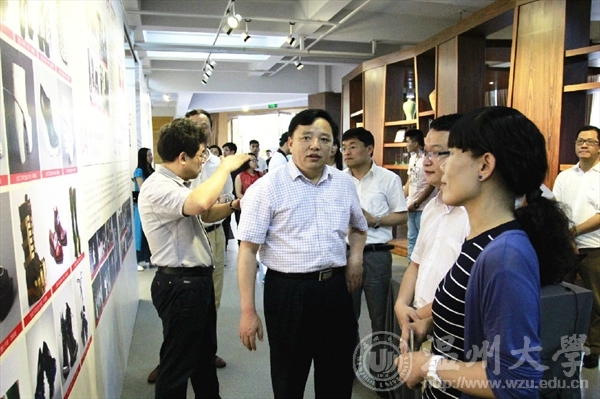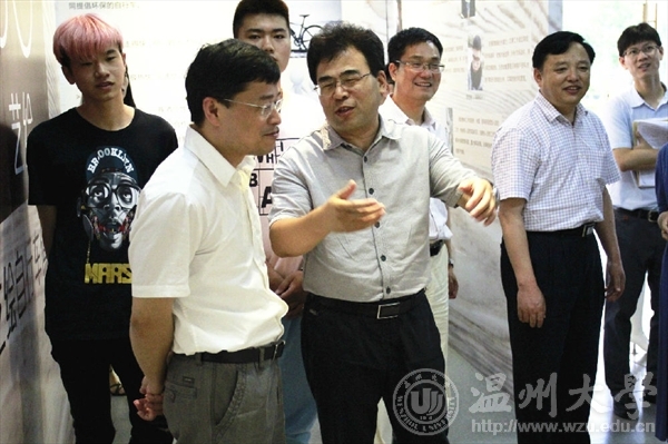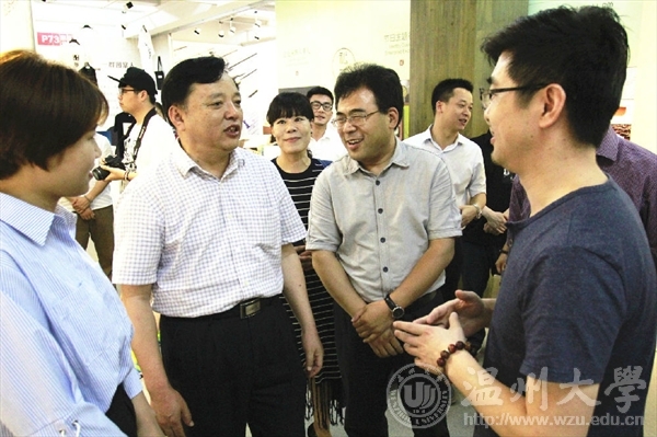 6月15日上午,全国创新创业50强评审专家陈年友、李斌、陈学军、陈森一行来金沙官网学生创新创业实践场地参观和实地考察,校党委副书记牟德刚、副校长薛伟及相关部门负责人等一行领导陪同参观调研了温州时尚学院和“融艺优品”创客空间的创新创业项目。