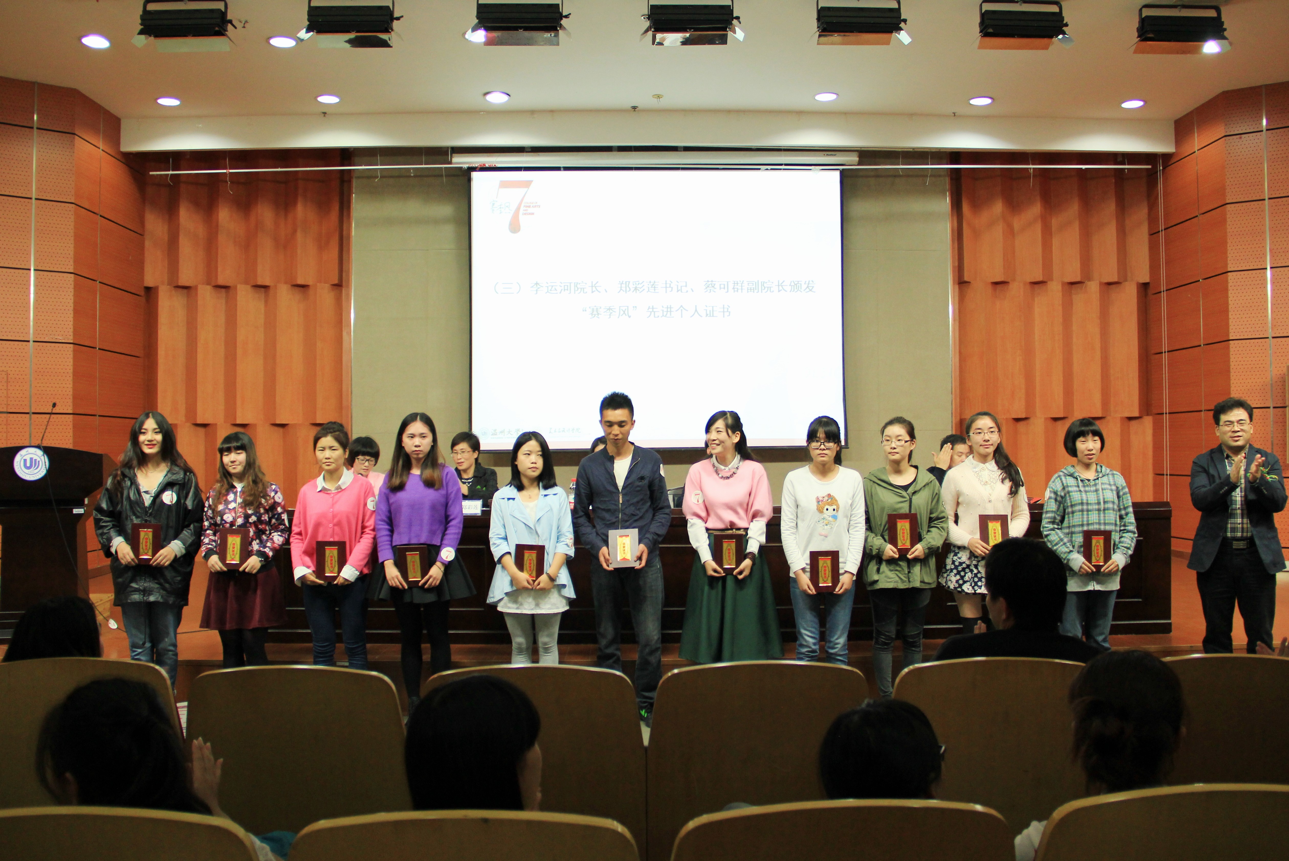 接着,郑彩莲书记宣读了“赛季风”先进个人名单、优秀指导老师名单、优秀创新创业团队名单。随后,伴随着欢快的音乐,获奖同学和指导老师走到台前,由潘玉驹部长、屠霁霞副书记、李运河院长、郑彩莲书记、蔡可群副书记为他们颁奖,并表示祝贺。那一张张自豪的笑脸诠释了拼搏与成功之间的联系,激励着台下同学积极进取,砥砺前行。