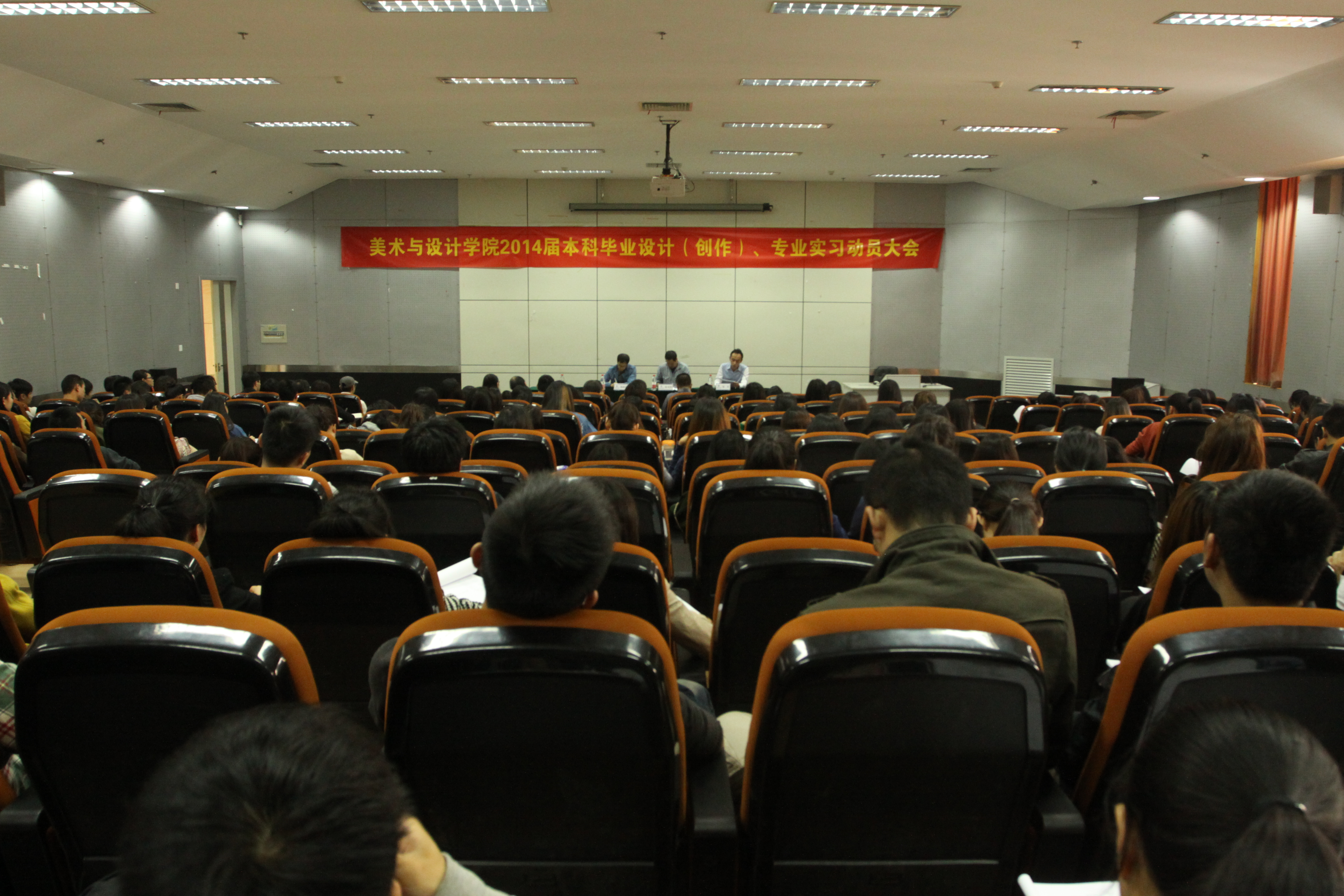 为顺利开展2014届毕业设计工作,11月8日上午,js6668金沙登录入口2014届本科毕业设计(创作)、专业实习动员大会在学校会展中心叶适厅举行。学院副院长蔡可群老师,副书记杨振海老师,教学科邹青老师,及美术、设计、服装三个系的系主任、各位毕业设计指导老师及全体14届本科毕业生参加了会议,会议由邹青老师主持。