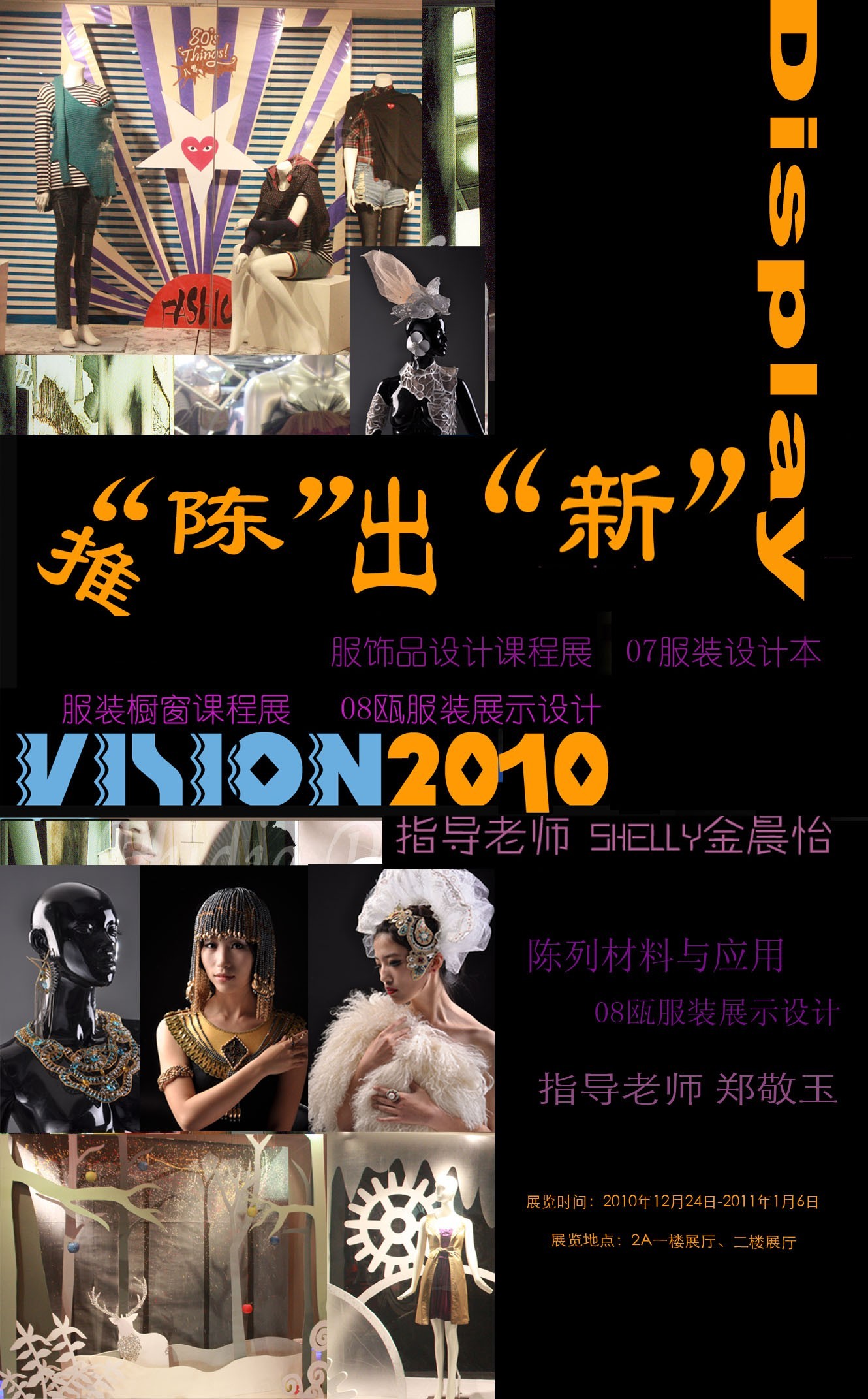 js6668金沙登录入口于2010年10月24日-2011年1月6日在2A二楼展厅举行07服装设计班和08瓯展示设计班推“陈”出“新”课程作品联展。此次课程联展由金晨怡老师的《服装橱窗设计》,郑敬玉老师的《陈列材料与应用》以及金晨怡老师的《服饰品设计》课程组成。以2010的圣诞作为主题,课程运用艺术手法触动着美的感受,更是启发学生商业设计思维的根本。js6668金沙登录入口党总支书记郑彩莲,js6668金沙登录入口院长李运河、服装系副系主任张振岳、各学校科室以及来自其他院系的师生共一百余人参加了本次活动。 js6668金沙登录入口院长李运河在观看展览时说:“这是续去年开始的创新争优活动的特色活动课程联展的又一次精彩的升华。学生作品题材丰富,在这些作品中也体现了老师教学方式的灵活多样,设计思想的无拘无束及同学们较强的动手能力。使金沙官网展示设计专业方向在专业交流与实际应用方面上升到一个更高层面。”课程展本着“给学生创造展示自己的平台,加强实践环节的教学,激发学习兴趣”这一宗旨,在金晨怡老师和郑敬玉的精心指导下给大家带来一场视觉盛宴,也是同学对指导老师教学成果的一次汇报。推“陈”出“新”的意思是突破创新的设计理念,利用独有的陈列装饰和商品展示技巧,让商品在道具、辅助商品、装饰品及灯光的衬托下闪亮登场,从而使商品由呆板变得鲜活,将商品优势最大程度展示出来,达到促进产品销售、提升品牌形象的目的。也通过陈列展览这个平台来推销自己的设计作品。 推“陈”出“新”是学生对服装展示专业方向的激情与热爱,对课程的学习体验,也是学生们用心去打造的创新陈列视觉效果。通过作品展览既可强化学生的社会适应能力和实际动手能力,培养商业化的思考习惯与创新意识的体现;另一方面加强交流与展示学生风采,向社会推荐我们优秀的学生和作品,提高了社会影响力和就业率。 据了解,此次展览特色在于在教学上着重与市场的紧密结合。此次展览邀请了嫁依工坊设计总监胡亚迪,3W摄影董事兼设计总监王雁和市服装商会设计师专业委员会秘书长曾贵等来自企业的专家对学生作品进行点评。浙江婉甸服饰董事长蒋海、浙江飘蕾服饰董事长黄瑞东、浙江雪歌服饰公司董事长助理熊伟对作品给于了高度的评价。另一亮点是此次学生们的橱窗设计作品已经被时代购物广场童装区和银泰百货所运用,3W摄影董事兼设计总监王雁马上相中了学生徐晨大胆而富有时尚的“僵尸新娘”主题的橱窗。此次展览后导师带领学生与时代广场和3W摄影签订了横向课题,为他们定期设计制作橱窗。