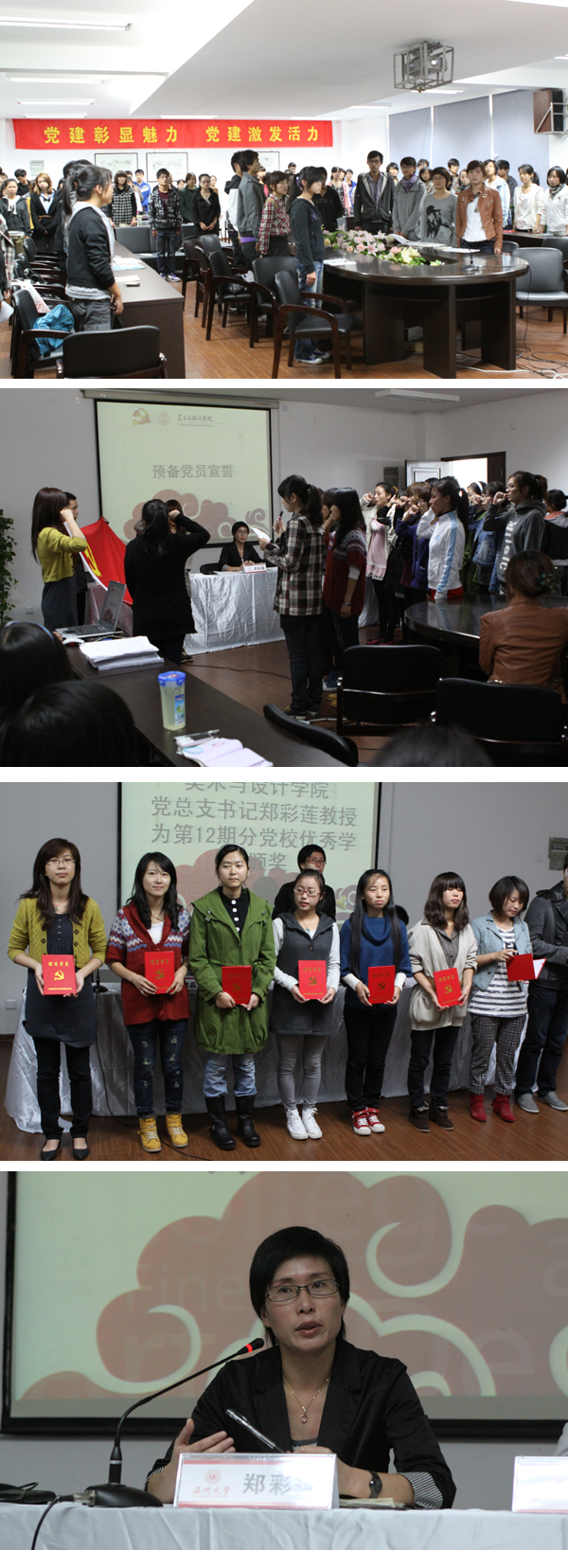 10月27日下午,js6668金沙登录入口第13期业余党校开学典礼在2B4001隆重举行,出席会议的有js6668金沙登录入口党总支书记、分党校校长郑彩莲教授;学生科科长徐聿淼老师;学生科辅导员李剑军老师、刘英丽老师,同时出席的还有各学生支部书记、部分党员代表及院党校近百名学员,典礼由学生科辅导员李剑军主持。 典礼开始,激昂的国歌奏响,全体师生肃穆而立,合唱国歌。接着,学生预备党员在庄严的气氛下宣誓。学生党员代表苏明明和本期党校学员代表吕旦文同学发言,她们号召全体学员以饱满的热情、全面的投入、实际的行动投入到党校学习之中,珍惜此次机会,了解党的光辉历史,宣传党的方针路线,提升自我的政治素养,争取早日成为合格的共产党员。 典礼上郑彩莲书记为学院第13期党校优秀学员颁奖,同时刘英丽老师和徐聿淼老师宣读了本次业余党校学习的相关文件和注意事项,对于党校学习的组织与管理、学时计划、培训对象与内容、考勤纪律以及结业考核形式等进行了详细的说明与解读。 随后郑彩莲书记对于党校新学员表示热烈的欢迎,并语重心长地对新学员提出了殷切希望,郑书记表示,党史是一本厚厚的历史,这次党校学习形式包括专题辅导、讨论交流、音像放映等形式,希望全体学员珍惜学习机会,学历史,学党史,积极向党组织靠拢,把学到的知识应用到学院的“创先争优”以及建设优良学风班的活动中去。她提出四点希望,首先,业余党校是组织搭建的学习和提高平台,全体学员应该珍惜学习机会;其次,业余党校是组织提供的舞台,全体学员要结合课上所学,在课下及时领会和消化,积极展示自我;再次,没有规矩不能成方圆,党校学习中要遵守纪律,严于律己,不辱使命;最后郑书记用生动的比喻号召全体学员发挥模范带头作用,js6668金沙登录入口是一艘大船,全体学员都是船上一分子,无论是舵手还是船长,都要在工作和学习中注意一言一行,争取使船游得更快、更稳、更远。 据悉,此次党校学习共26课时,其中专题辅导15课时,讨论交流、音像放映、实践活动各占3课时,结业考试2课时,内容丰富,形式多样。 开学典礼后,郑书记为全体学员上第一次党课——《大学生的入党动机》。