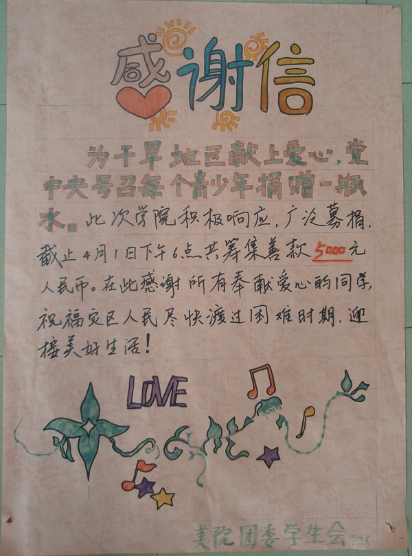 为响应共青团中央号召,弘扬“一方有难,八方支援”的中华民族传统美德,帮助西南灾区人民战胜灾害、顺利度过难关。4月1日上午,js6668金沙登录入口团委学生会发起了“抗击干旱,你我同在——为西南灾区献爱心”活动,倡议全院同学为灾区献爱心。
