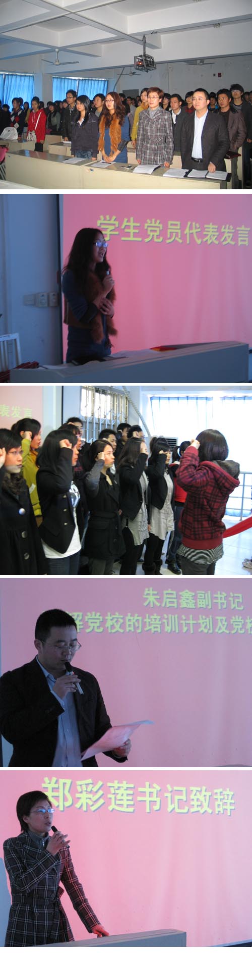 近日,js6668金沙登录入口第十二期业余党校在学院党总支的高度重视和关心下,顺利开班。本期党校学生报名踊跃,经过筛选,共85位学生光荣的成为了本期党校学员。 2010年4月9日,js6668金沙登录入口第十二期业余分党校开学典礼在美术楼2A308隆重举行。学院党总支书记郑彩莲、副书记朱启鑫,各学生党支部书记、学生党员代表及分党校学员等100余人参加了此次开班典礼。仪式由徐聿淼老师主持。 庄严的国歌声后,学生党员代表尹慧纯同学介绍了自身发展的经历,她勉励学弟学妹们要积极地向党组织靠拢,努力学习,提高自身各方面的知识和水平,争取早日加入党组织。学员代表学员发言。表示一定会认真学习好党的知识和精神,一定不会辜负党组织对他们的寄予和期望,一定会用实际行动证明他们是优秀的,为学院的发展贡献自己的一份力量。 郑彩莲书记代表学院党总支对能参加本次业余党校的同学表示祝贺,同时希望大家能认真对待本次机会,努力学习,争取能以优异的成绩向党组织汇报。并对学员提出三点希望。首先希望学员能通过学习,加深对党组织的认识;其次,她希望学员能持之以恒,通过自己的实际行动,处处体现先锋模范作用。最后,她希望全体学员能在党校的学习中,遵守纪律,认真学习,争取早日在思想上入党进而在组织上入党,并预祝本次培训班取得圆满成功。 学院党总支副书记朱启鑫就本期党校学习计划、学习要求等做了安排。班主任李剑军老师宣布了班委组成成员,并就分党校的有关规章制度作了详细的说明。 最后,在开学典礼上学院32名新学生党员在徐聿淼老师的带领下庄严宣誓,表达了对党的忠诚以及为共产主义事业奋斗终身的决心。这种庄严、激情的气氛深深地感染了党校学员们。 据悉,本次业余党校在1个多月的时间里通过理论学习、观看红色影像、分组讨论、辅导报告等理论与实践相结合的方式学习党的知识。