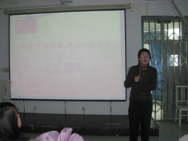 2010年4月14日星期三下午,js6668金沙登录入口第12期院党校第一讲——“大学生的学习动机”在2A308顺利召开,由美院党总支书记郑彩莲老师担任主讲人。