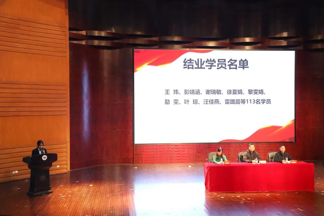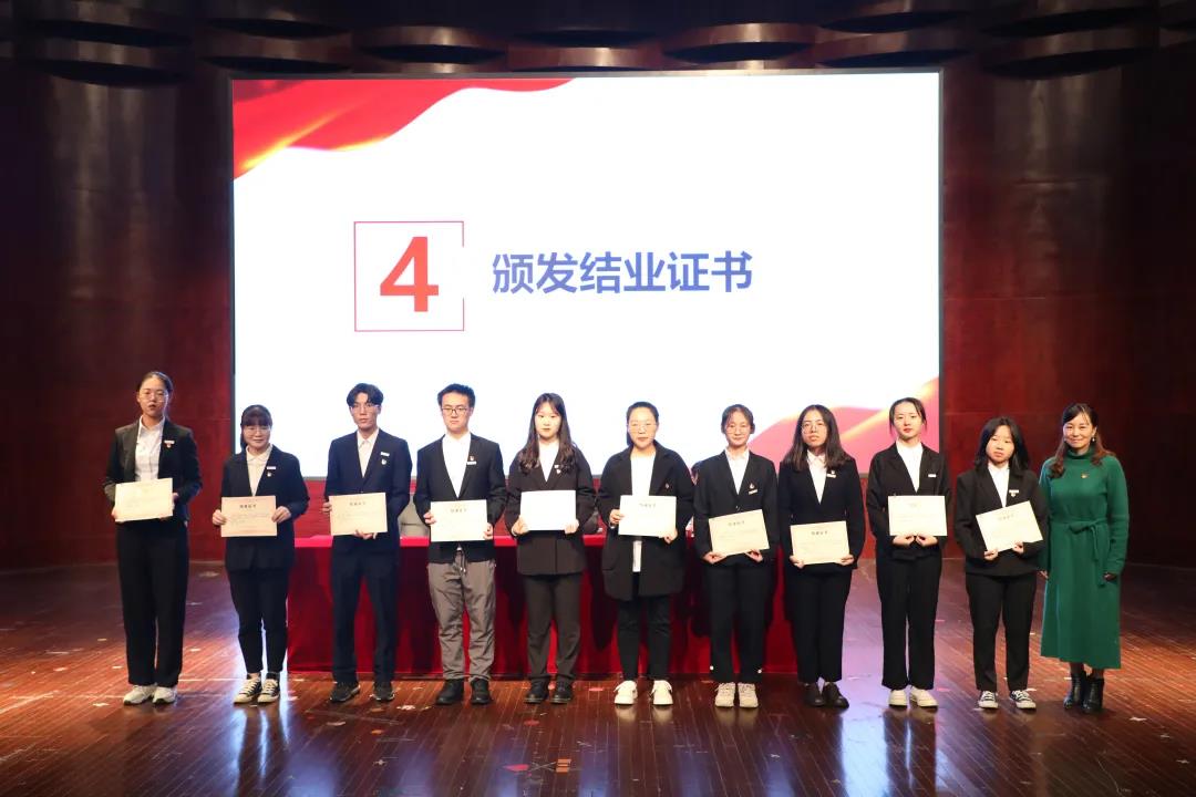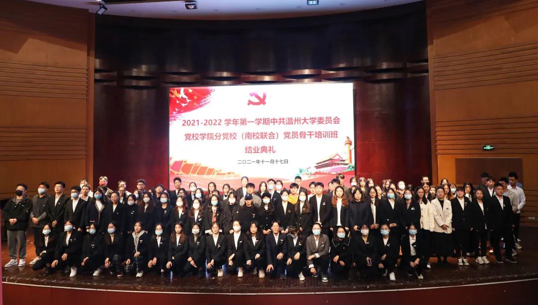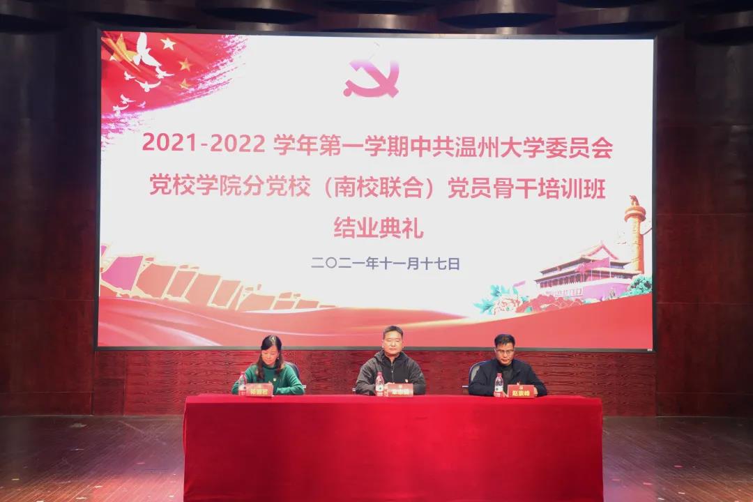 2021年11月17日,2021-2022学年第一学期中共js6668金沙登录入口委员会党校学院分党校(南校联合)党员骨干培训班结业典礼在南校音乐厅顺利举行。数理学院党委副书记章志图老师,生命与环境科学学院党委副书记赵崇峰老师,js6668金沙登录入口党委副书记杨丽君老师和全体124名学生党员骨干出席了本次结业典礼。本次结业典礼由js6668金沙登录入口党建负责老师王颖主持。一、奏唱国歌此次结业典礼在庄严的国歌中拉开序幕。二、学员代表发言首先,学员代表徐严俊同学代表全体学员对培训班老师表达了感谢。其次,他表示,经过一周的党员骨干培训,大家深深感受到了支部党务工作的严谨性和重要性,同时也对支部党员各项流程及规章制度有了更深刻的理解,他坚信大家都会努力做好党员流程的每一步,为成为基层工作的坚强后盾不懈努力。最后,徐严俊同学代表本次参加党员骨干培训班的全体同志郑重承诺:一、努力学习,以过硬的理论知识,武装自己的头脑,积极发挥党员的先锋模范作用。二、以执着的信念,优良的品格,丰富的知识,过硬的本领,永做走在时代前列的先进者、开拓者、奉献者。三、宣读结业学员、优秀学员和最佳理论学习奖名单一周的时间,党员骨干们在培训中凝聚了思想、积累了知识。党员骨干培训班班长张柠同学公布并宣读了结业学员名单及表彰优秀学员的决定。本次党员骨干培训班共124名学员参加,有113名学员顺利结业。其中彭靖涵等25名同学被评为“优秀学员”,朱沁怡等9名同学被颁发“最佳理论学习奖”。四、与会领导为结业学员、优秀学员和最佳理论学习奖获得者颁发证书杨丽君老师为学员代表颁发结业证书章志图老师为优秀学员代表颁发优秀学员荣誉证书赵崇峰老师颁发最佳理论学习奖至此,2021-2022学年第一学期中共js6668金沙登录入口委员会党校学院分党校(南校联合)党员骨干培训班结业典礼顺利结束。一周的培训,时间不长,但希望大家时刻牢记一名党员的责任和义务,以优秀党员的标准严格要求自己,做到忠诚、干净、担当、以身作则,不断提高党务工作技能,以实际行动为我校的基层党组织建设添砖加瓦。