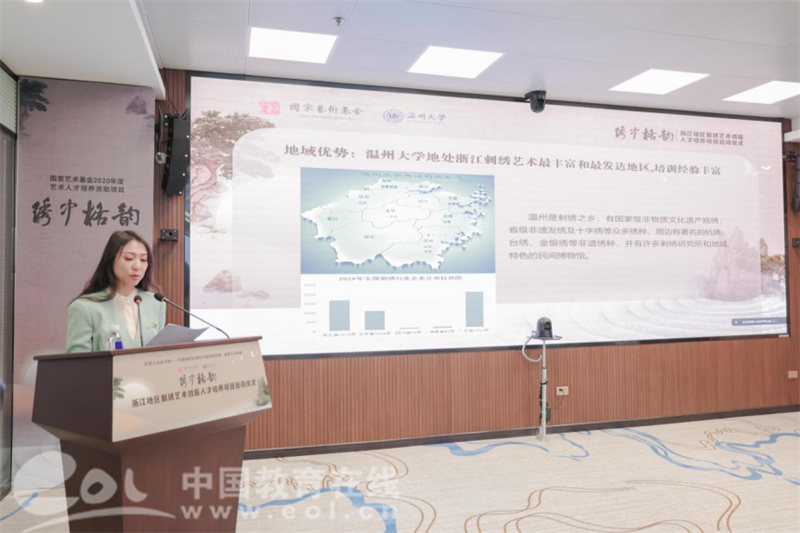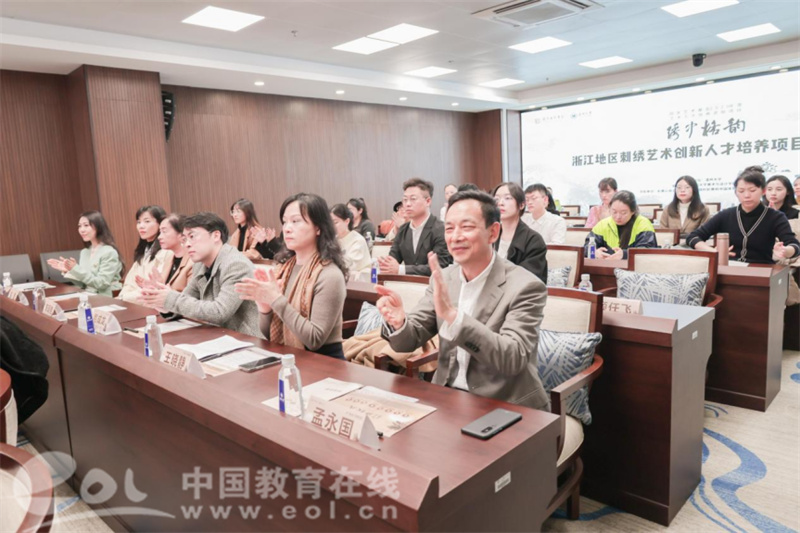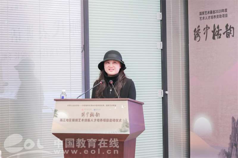 中国教育在线浙江站讯 (记者 陈显婷)近日,由国家艺术基金资助,js6668金沙登录入口承办的“浙江地区刺绣艺术创新人才培养”项目启动仪式在js6668金沙登录入口隆重举行。温州市文化广电旅游局、中国非遗保护协会、js6668金沙登录入口有关领导,项目导师、专家以及来自北京、上海、江苏、浙江等地的学员共计40余人出席。