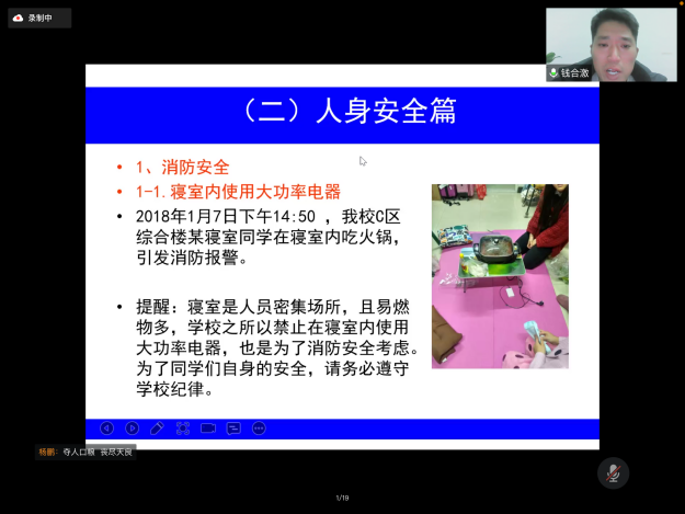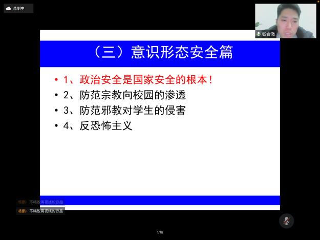 2022年2月23日晚上,在新学期,学院组织形势政策报告会——js6668金沙登录入口2022年春季开学第一课暨安全教育专题讲座在腾讯会议上进行。本次报告会的主讲嘉宾js6668金沙登录入口保卫处副处长钱合激老师,参加此次报告会讲座的有学院全体辅导员以及全院所有本研同学。学院学工办主任杨鹏老师主持了报告会讲座,介绍了本次报告会讲座的重要性以及的听课纪律。
