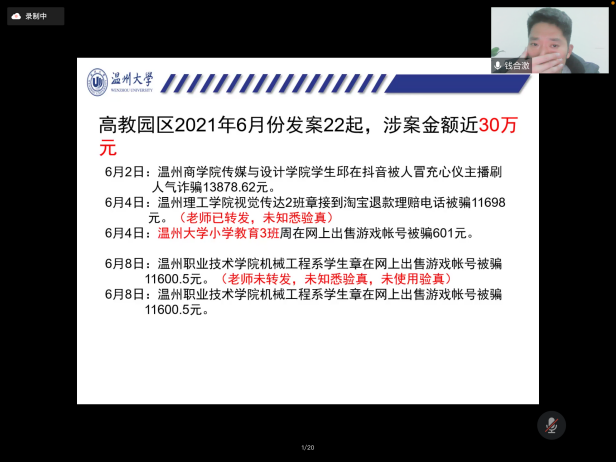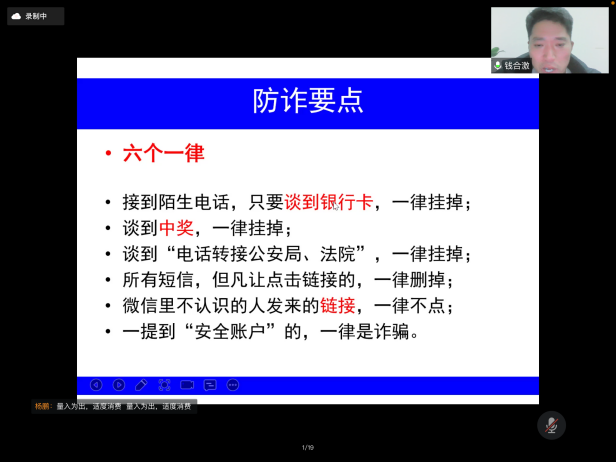 2022年2月23日晚上,在新学期,学院组织形势政策报告会——js6668金沙登录入口2022年春季开学第一课暨安全教育专题讲座在腾讯会议上进行。本次报告会的主讲嘉宾js6668金沙登录入口保卫处副处长钱合激老师,参加此次报告会讲座的有学院全体辅导员以及全院所有本研同学。学院学工办主任杨鹏老师主持了报告会讲座,介绍了本次报告会讲座的重要性以及的听课纪律。 首先,钱合激老师指出大学生常见的安全问题主要分为财产安全、人身安全、意识形态安全、反诈防诈、寝室消防安全、宗教知识教育等,共同建设和谐美好的平安校园需要全体同学的努力。钱老师结合最近js6668金沙登录入口城内相关诈骗案件的最新情况,警示我们诈骗离我们并不遥远,除了电话诈骗和网络兼职诈骗,还要防范钓鱼网站的诱惑,提高警惕,防诈反诈。同时,他也向同学们介绍了网络诈骗的特点,常见的电信诈骗手段,讲解防诈骗常识,引导学生树立正确的消费观以及在生活中如何防止被套路贷等知识。钱老师通过经典案例、相关反诈宣传视频、图片,列举了电信网络诈骗犯罪的几种常见形式,有针对性地向同学们阐述了如何识别防范电信网络诈骗及上当后的补救措施,并号召同学们:电信网络与我们息息相关,我们要强化系统观念与法治思维,提升防范和辨别诈骗的能力和水平,推动建设更高水平的平安校园。 其次,钱合激老师通过消防安全、交通安全、户外活动、毒品伤害四块内容来讲述大学生的人身安全。学生宿舍是高密度人群居住的地方,防火安全显得尤为重要,作为宿舍的主体——学生,要重视安全防火的重要性,提高思想认识,防范胜于救灾,责任重于泰山。同时,钱老师还提到毒品的危害,这些年由于国际毒品的泛滥,毒品像一头张开血盆大口的猛兽,正飞快吞噬着年轻的一代,它无情的破坏着我们的家庭和社会,导致多少家庭家破人亡,国家财富流失。就此,钱合激老师向大家呼吁:人的生命只有一次,它是无价的,也是脆弱的,它承载着你的亲人、朋友和整个社会赋予你的责任,它承受不起任何不负责任的冒险,所以我们一定要珍惜生命,远离毒品。 最后,钱合激老师为大家讲了意识形态安全,他提到大学时代是大学生“三观”及信仰形成的重要时期,稍有不慎,宗教组织便有机可乘。所以我们应该时刻保持清醒的头脑和政治警觉性,不能对宗教渗透的消极影响视而不见或放任自流。此外,很多人都认为邪教离我们很远,甚至觉得自己不可能被邪教蛊惑。但在现实生活中,邪教组织其实套路百出、无孔不入。他们常常借用各种唬人的幌子包装自己,不断更新骗人花样,稍有不慎可能就会跌入邪教圈套。 “你的平安,是对家人最好的关爱!”生命只有在安全中才能永葆活力,幸福只有在安全中才能永具魅力。安全构筑了我们美好的家园,在安全的问题上,来不得半点麻痹和侥幸,我们必须防范在先、警惕在前;必须要树立高度的安全意识,人人讲安全,时时讲安全,推动建设更高水平的平安校园。
