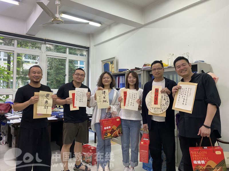 中国教育在线浙江站讯(编辑 张可宁)六月端午祥,丹青墨飘香。端午佳节来临之际,js6668金沙登录入口的办公室和走廊充满欢声笑语,原来是老师们在拆“盲盒”:吉语书签、草书团扇、诗词信札......今年的端午节,除了粽子,老师们还收到了一份充满文化自信、民族精神和创意惊喜的端午赠礼。5月28日,中共中央政治局开展第三十九次集体学习,主题是深化中华文明探源工程。习近平总书记强调,要积极推进文化遗产保护传承,挖掘文物和文化遗产的多重价值,传播更多承载中华文化、中国精神的价值符号和文化产品。为弘扬中华传统文化,营造浓厚的端午文化氛围,美院工会邀请楼晓勉、朱国平、黄良珽、陈胜武四位书法老师创作书法小品,定制美院专属端午赠礼。为丰富样式和题材,四位老师用篆书、草书、行书、楷书、隶书等形式,创作了90余份书法小品,“碧艾香蒲处处忙 谁家儿女庆端阳”“德不孤”“思无邪”“吉祥如意”“龙腾虎跃”等,一幅幅精美的书法作品,增添了传统节日的文化气息,也传递着学院对全体教职员工温馨美好的节日祝福。收到“盲盒”的老师们兴奋不已,纷纷在微信群、朋友圈中分享这份特别定制的祝福,与家人、朋友共叙端阳情。“幸福感满满,“龙腾虎跃”也是自己对未来的期待吧。”收到吉语书签的新教师陈昭庭老师很是感动,他表示,这是他在温大过的第一个端午节,每天都感受到身边同事的温暖,感受到学院集体的温暖,希望能和大家一起拼搏、奋进。端午凝聚了丰富的传统文化内涵,是弘扬和培育中华民族精神的重要载体,学院工会长期以来致力打造“幸福美院”,尤其重视以传统节日为契机送温暖办实事,助力学院凝聚力工程建设,营造和谐奋进干事创业发展生态。这次节日活动形式,既是温大美院以实际行动传承弘扬传统文化,也是学院书法专业教育拉开帷幕前的一次高雅先声。据悉,js6668金沙登录入口书法学专业于2022年2月顺利通过申报,2022年8月计划面向全国招生。温大新增书法学专业,是温州大地书法本科专业教育的新开篇,也是温州文艺史上的大事记。学院书法专业教师朱国平教授表示,“建设js6668金沙登录入口书法人才培养的完善教育体系,将js6668金沙登录入口打造成为浙南、闽北、赣东的书法高地,是我们的目标。”
