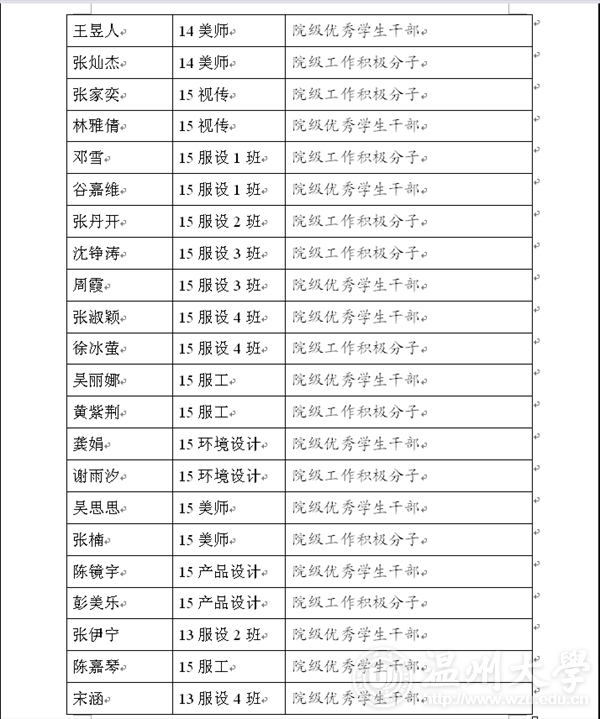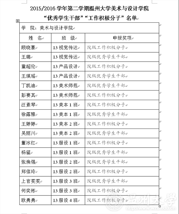 现将2015-2016学年第二学期js6668金沙登录入口“优秀学生干部”“工作积极分子”名单公示如下,如对评选结果有异议,请及时联系美术学院学生科。