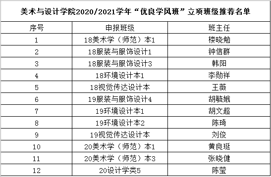 根据js6668金沙登录入口2020/2021学年“优良学风班”立项申报工作的通知要求,经班级申报、学院初步审核,现决定对18美师本1等12个班级进行立项推荐,现将结果予以公布。