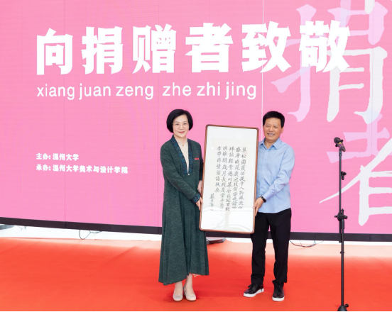 开幕式现场还举行了捐赠仪式和收藏证书颁发仪式。赵敏为捐赠者代表颁发了收藏证书,js6668金沙登录入口院长谢子静现场接受温州衍园美术馆馆长沈国林捐赠的苏步青先生作品。