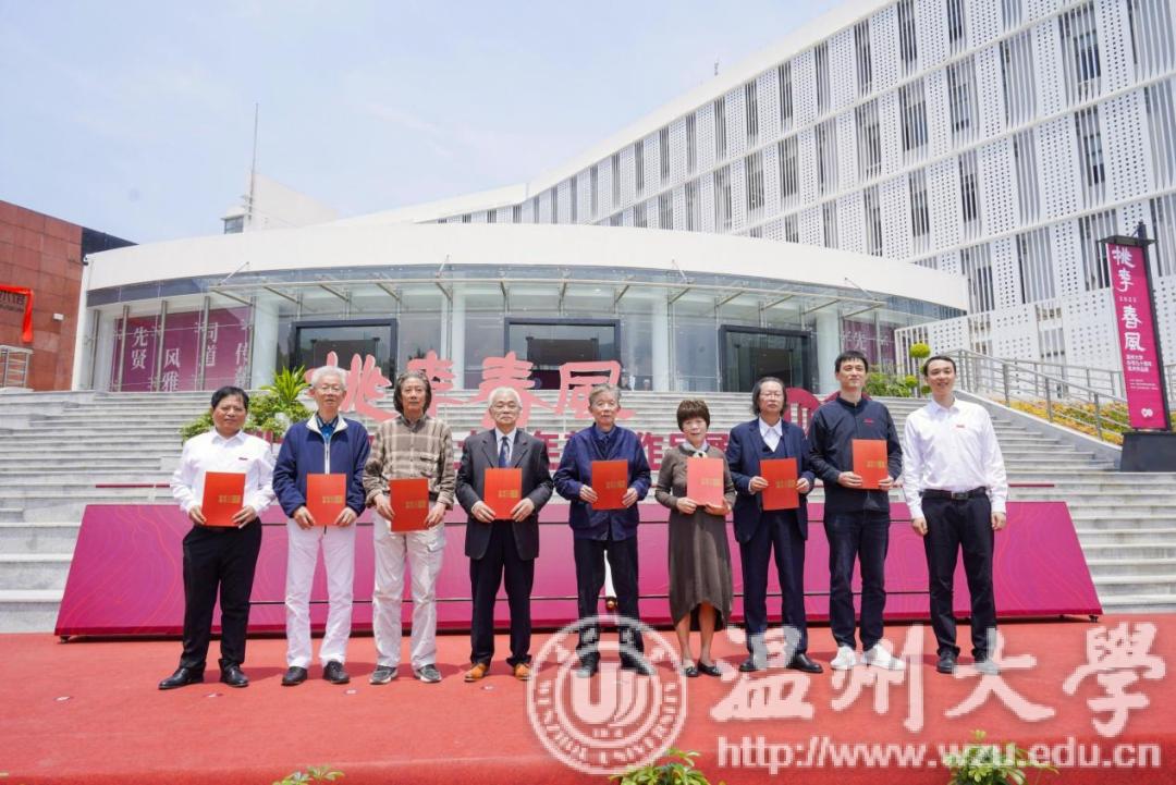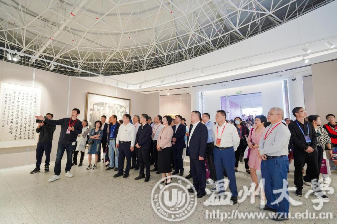 仪式结束,领导、嘉宾、校友、师生共同进入美术馆参观作品展。本次展览分为“先贤风雅”“同道传薪”两大板块,共展出了156位先贤、名家、教师和校友作品,涵盖国画、油画、版画、水彩画、综合绘画、书法、篆刻等种类。展览基于近现代中国美育运动、美术创作的宏大背景,对近代以来温州的书画创作与教育做一个初步的回溯,以近代几位具有代表性的书画大家与“美育大先生”开篇,延伸至温州区域美术创作,以及当代在全国卓有影响的重彩工笔画、书法、版画、水彩画的温籍代表作者;同时梳理学校的美育脉络,展示几代温大人的书画创作,宏扬与传播js6668金沙登录入口的人文风采。