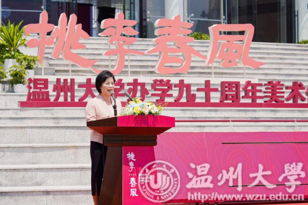 温州市委常委、宣传部部长施艾珠致辞。她指出:js6668金沙登录入口高规格建设一流美术馆为温州文化基础设施增添新的力量,必将成为温州推动公共文化服务的新高地。同时,她希望js6668金沙登录入口发挥高校美术馆独特优势,开展学术交流,举办高品位展览,加强美育教育,丰富群众精神文明生活、提升城市文化品位,努力把美术馆打造成为开展对外交流的“金名片”,不断提升温州城市、js6668金沙登录入口的知名度和影响力,大力参与推进温州文化振兴、书画名城建设和公共文化建设;充分发挥高校人才和资源优势,开展温州美术史等研究,以美术研究助力深化“温州学”研究;在美术精品创作、美术人才培育等方面发挥重要阵地作用,为加快打造温州新时代文化高地提供强大动力,为高质量发展建设共同富裕示范区市域样板贡献艺术才智和力量。